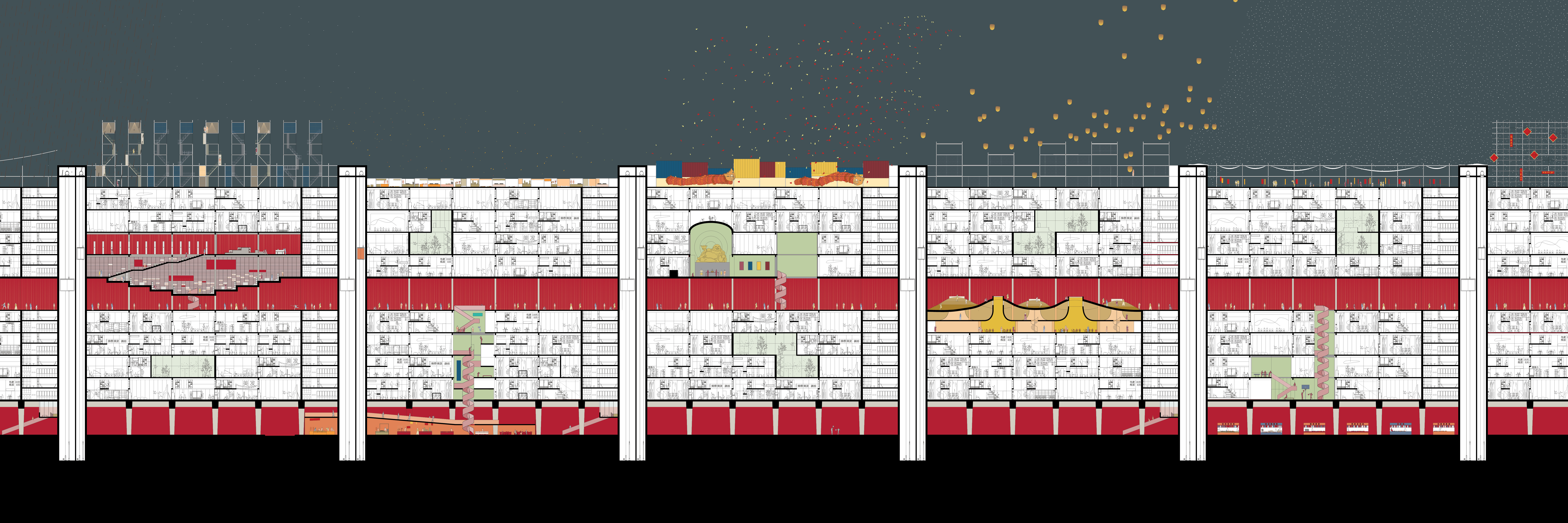 The living modules are designed through close analysis of the current living modes of migrant workers. The smallest domestic unit houses intimate groups of family, friends or fellow villagers. This minimal unit has a balcony, a double height free space and a framed space for sleeping and storage. Four domestic units correlate to a collective space where multiple commercial/ public programs are interweaved with domestic programs. This spatial module is then propagated, and start to generate an internal small scale economic system. Based on the units’ autonomous production of services in the collective areas, the residents would share and exchange their production with little or no money involved. Toilets, shower, bath and basic washing activities are shared. Every five units, there is a structural core with elevators, stairs, service room.
